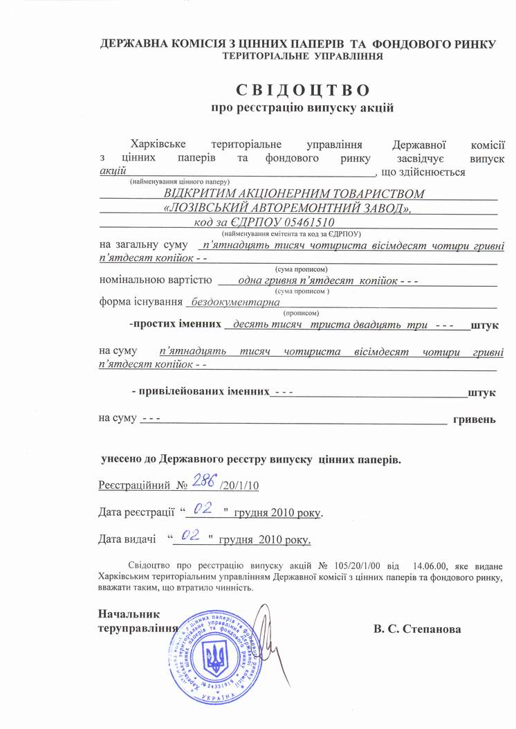 Cвідоцтво про реєстрацію випуску акцій (2010) (розміщено 14.05.2012)