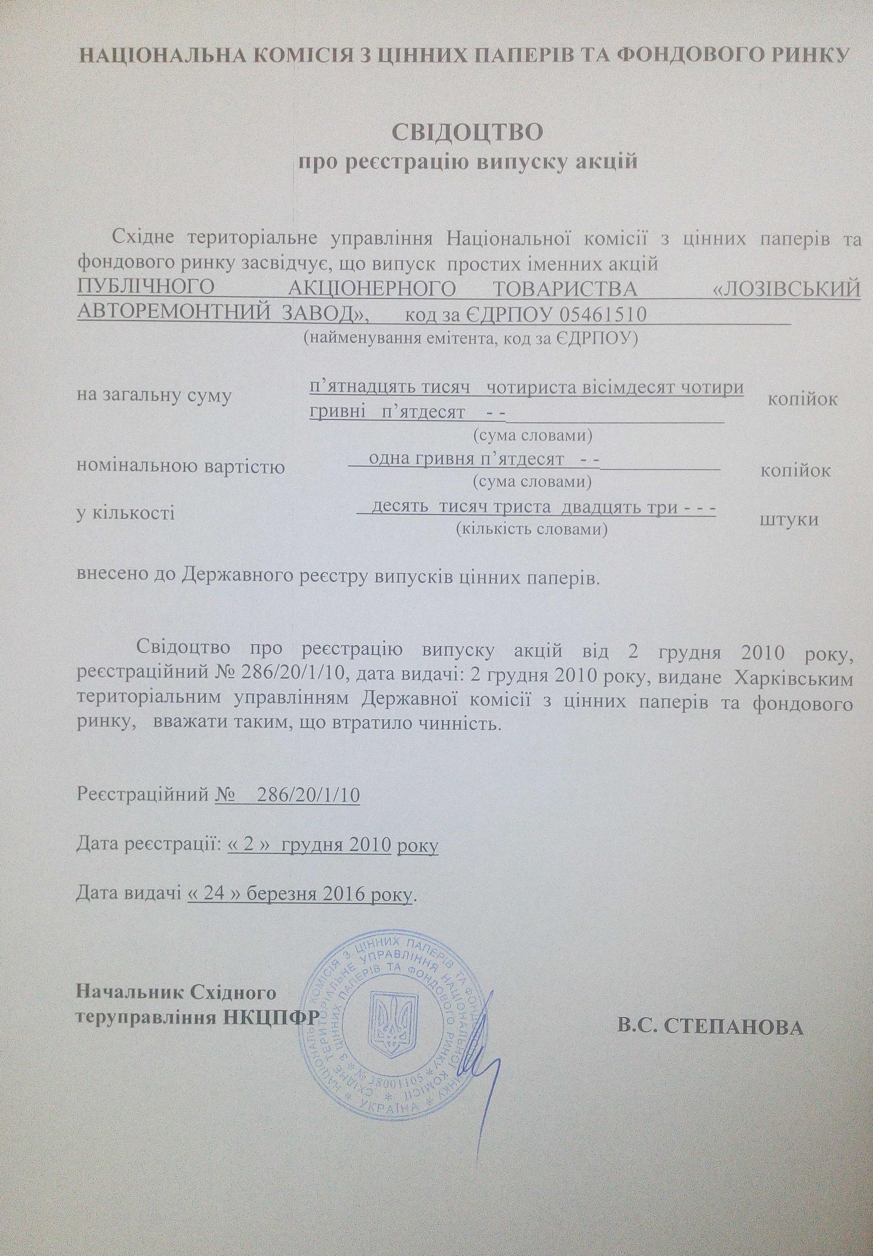 Cвідоцтво про реєстрацію випуску акцій (2016) (розміщено 29.03.2016)